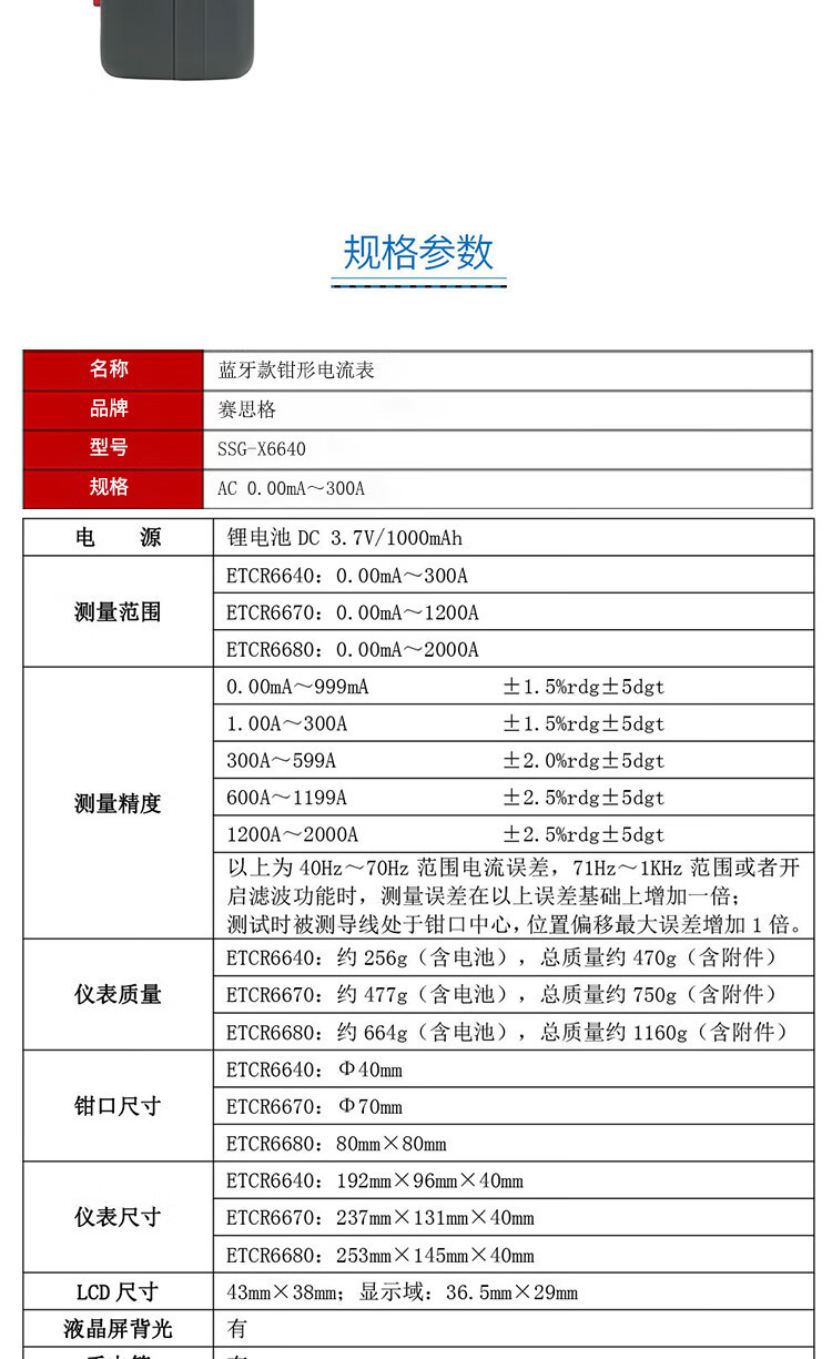 赛思格 SSG-X6640 AC 0.00mA~300A 蓝牙款钳形电流表 单位:台